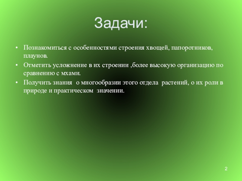 Задачи:Познакомиться с особенностями строения хвощей, папоротников, плаунов.Отметить усложнение в их строении ,более высокую организацию по сравнению с мхами.Получить знания о многообразии этого отдела растений, о их роли в природе и практическом значении.