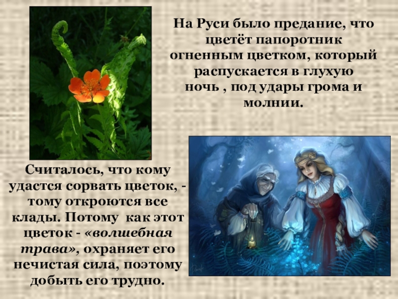 тому откроются все клады. Потому как этот цветок - «волшебная трава», охраняет его нечистая сила, поэтому добыть его трудно.