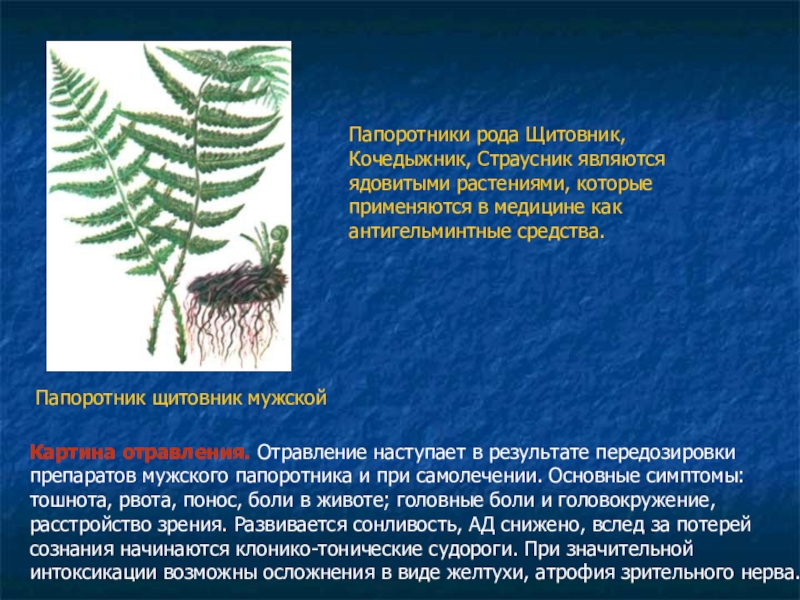 Папоротники рода Щитовник, Кочедыжник, Страусник являются ядовитыми растениями, которые применяются в медицине как антигельминтные средства.