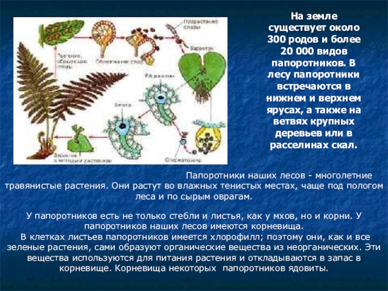 На земле существует около 300 родов и более 20 000 видов папоротников. В лесу папоротники встречаются в нижнем и верхнем ярусах, а также на ветвях крупных деревьев или в расселинах скал.