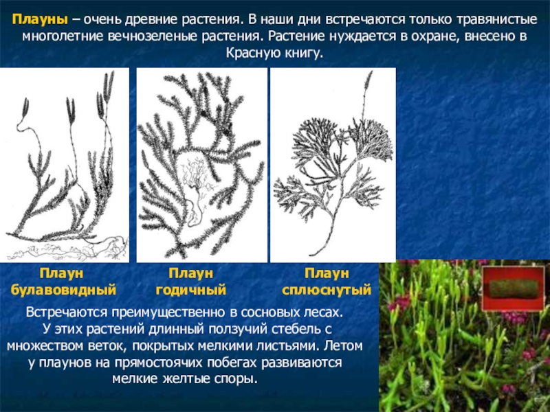 Плауны – очень древние растения. В наши дни встречаются только травянистые многолетние вечнозеленые растения. Растение нуждается в охране, внесено в Красную книгу.