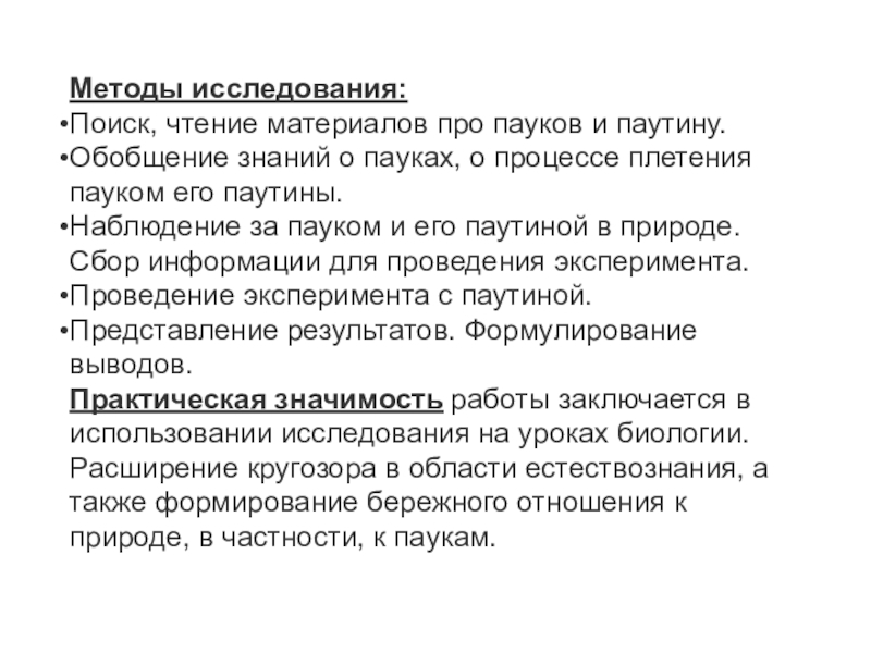 Практическая значимость работы заключается в использовании исследования на уроках биологии. Расширение кругозора в области естествознания, а также формирование бережного отношения к природе, в частности, к паукам.