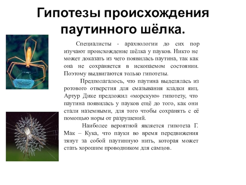 Слайд 9Гипотезы происхождения паутинного шёлка.