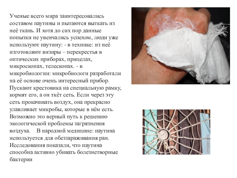 ткань. И хотя до сих пор данные попытки не увенчались успехом, люди уже используют паутину: - в технике: из неё изготовляют визиры – перекрестья в оптических приборах, прицелах, микроскопах, телескопах. - в микробиологии: микробиологи разработали на её основе очень интересный прибор. Пускают крестовика на специальную рамку, кормят его, а он ткёт сеть. Если через эту сеть прокачивать воздух, она прекрасно улавливает микробы, которые в нём есть. Возможно это верный путь к решению экологической проблемы загрязнения воздуха. В народной медицине: паутина используется для обеззараживания ран. Исследования показали, что паутина способна активно убивать болезнетворные бактерии