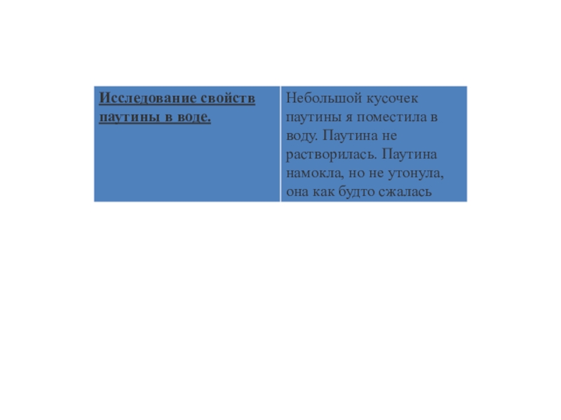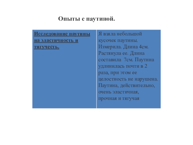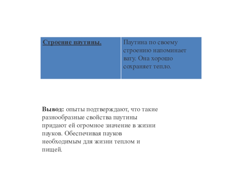 Слайд 20Вывод: опыты подтверждают, что такие разнообразные свойства паутины придают ей огромное значение