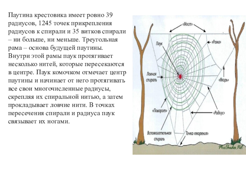 Слайд 12Паутина крестовика имеет ровно 39 радиусов, 1245 точек прикрепления радиусов к