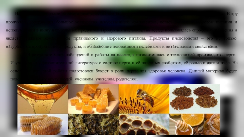 сохранении его здоровья. В эру продуктов, содержащих большое количество искусственных компонентов, встает вопрос о здоровом питании и использовании в пищу натуральных продуктов. Продукция пчеловодства всегда пользовалась спросом у населения и является важным компонентом правильного и здорового питания. Продукты пчеловодства – это не только натуральные продукты, но и продукты, и обладающие ценнейшими целебными и питательными свойствами.