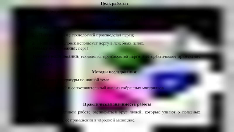 Предмет исследования: технология производства перги и ее практическое применение человеком.