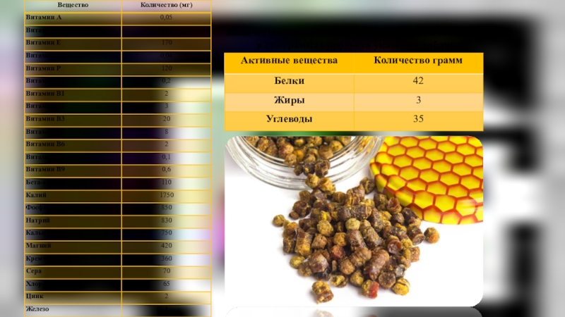 Слайд 5Количество минералов (микроэлементов) и витаминов в ста граммах продукта указано в