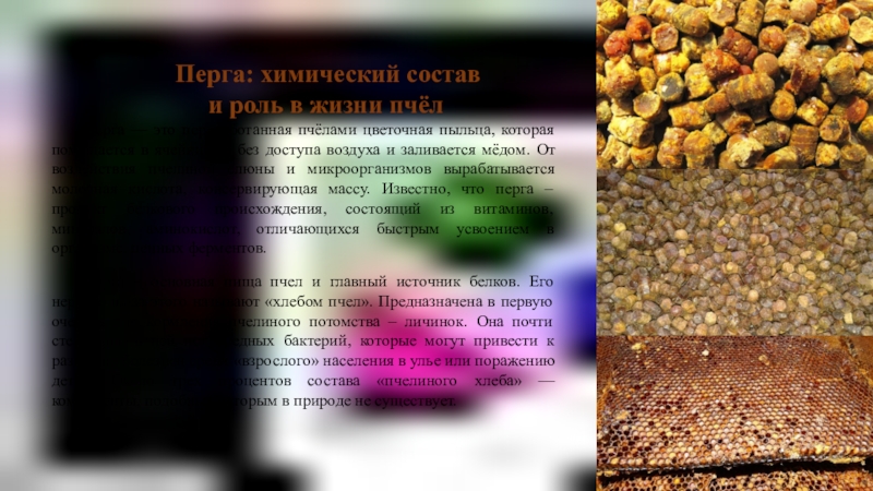 Перга – основная пища пчел и главный источник белков. Его нередко из-за этого называют «хлебом пчел». Предназначена в первую очередь для кормления пчелиного потомства – личинок. Она почти стерильна, в ней нет вредных бактерий, которые могут привести к развитию болезней среди «взрослого» населения в улье или поражению деток. Около трех процентов состава «пчелиного хлеба» — компоненты, подобных которым в природе не существует.