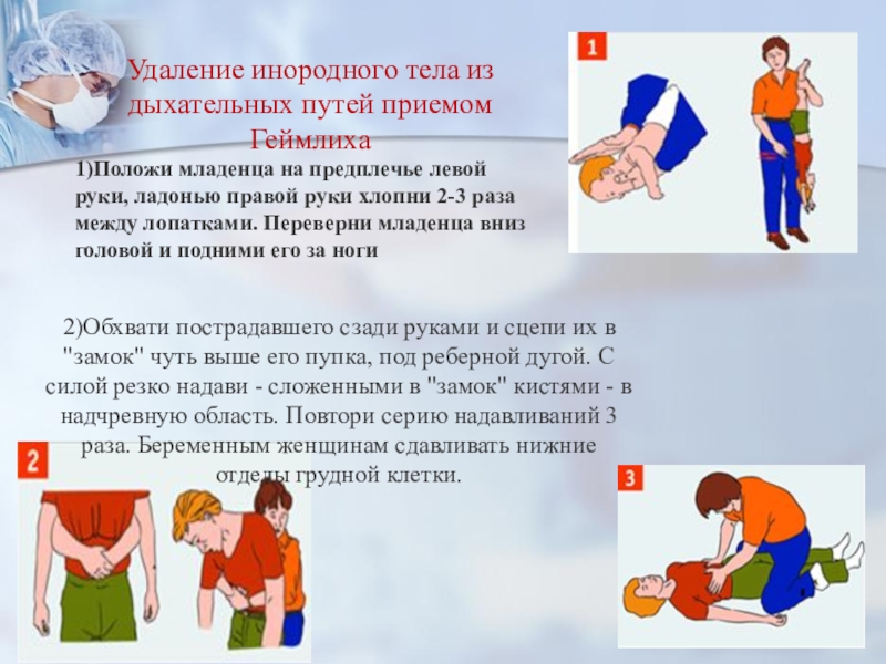 1)Положи младенца на предплечье левой руки, ладонью правой руки хлопни 2-3 раза между лопатками. Переверни младенца вниз головой и подними его за ноги