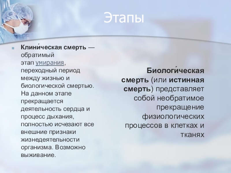Биологи́ческая смерть (или истинная смерть) представляет собой необратимое прекращение физиологических процессов в клетках и тканях