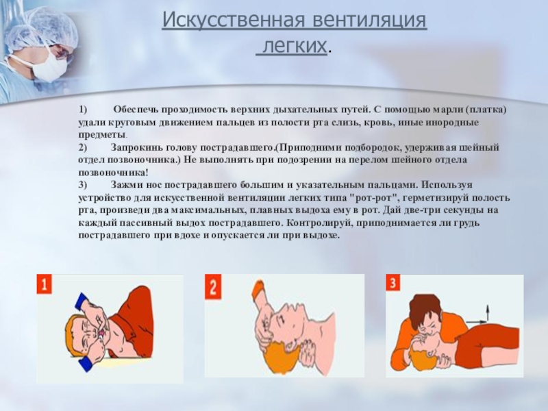 6) Чередуй 2 "вдоха" искусственной вентиляции легких (ИВЛ) с 15 надавливаниями, независимо от количества человек, проводящих реанимацию