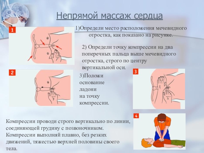 Компрессии проводи строго вертикально по линии, соединяющей грудину с позвоночником. Компрессии выполняй плавно, без резких движений, тяжестью верхней половины своего тела.