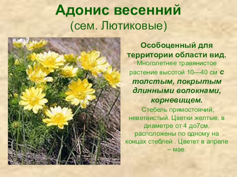 - 20 см высотой. Растет в степях, на буграх, открытых сухих местах.
