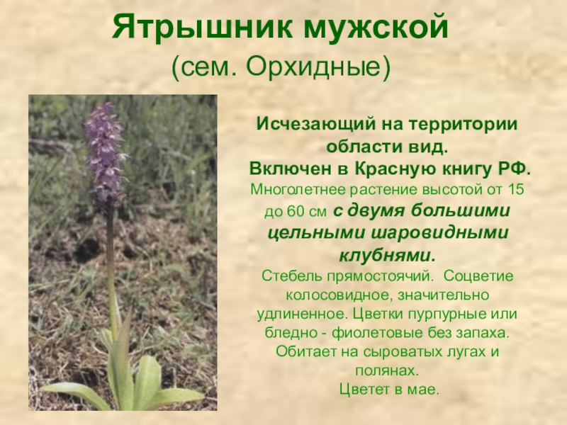 Стебель прямостоячий. Соцветие колосовидное, значительно удлиненное. Цветки пурпурные или бледно - фиолетовые без запаха. Обитает на сыроватых лугах и полянах.