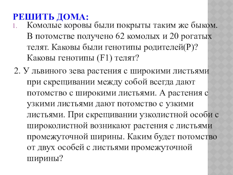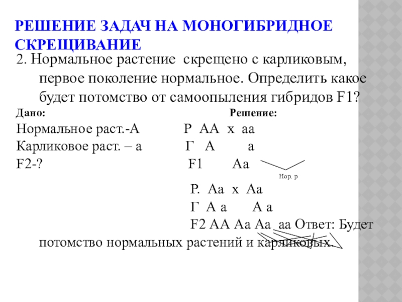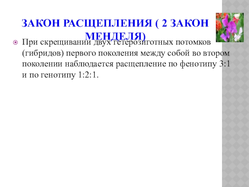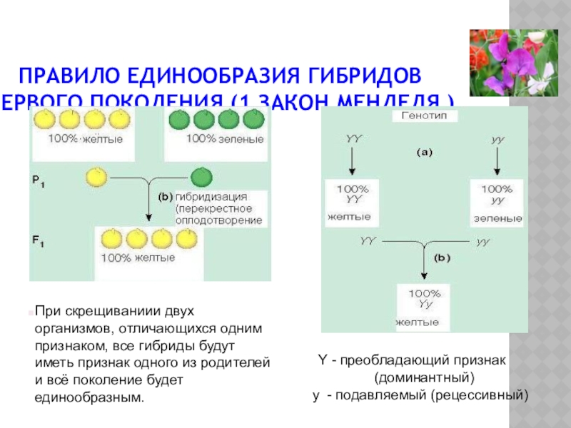 При скрещиваниии двух организмов, отличающихся одним признаком, все гибриды будут иметь признак одного из родителей и всё поколение будет единообразным.