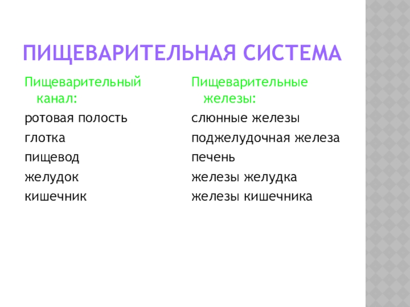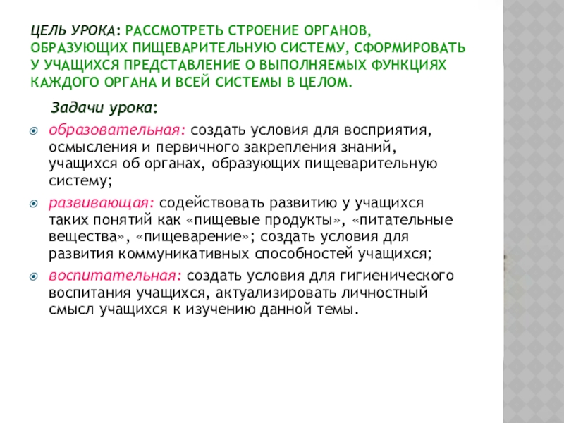 образовательная: создать условия для восприятия, осмысления и первичного закрепления знаний, учащихся об органах, образующих пищеварительную систему;