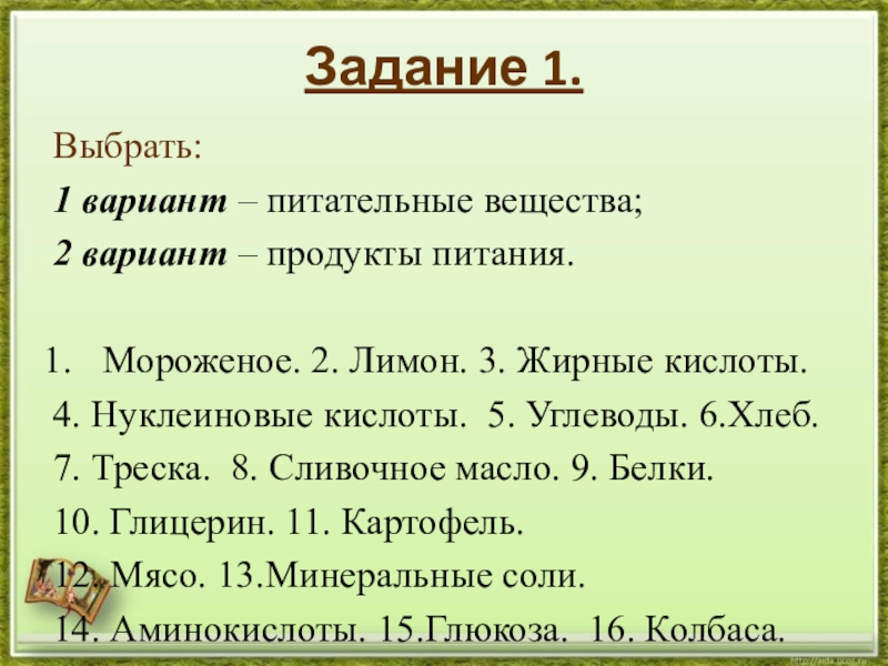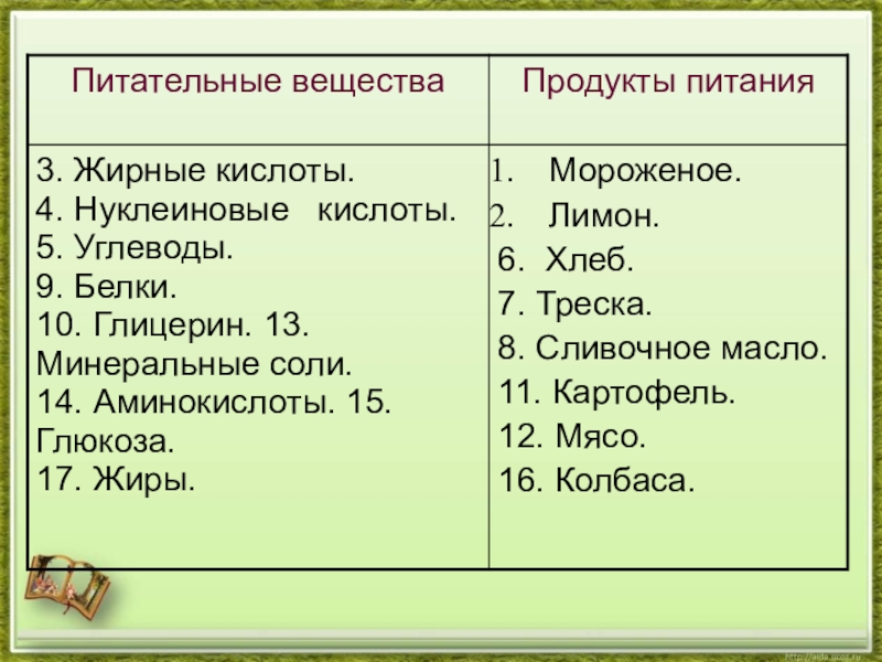 Мороженое. 2. Лимон. 3. Жирные кислоты.