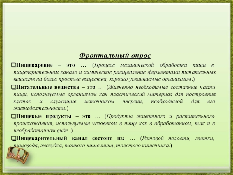Питательные вещества – это … (Жизненно необходимые составные части пищи, используемые организмом как пластический материал для построения клеток и служащие источником энергии, необходимой для его жизнедеятельности.)