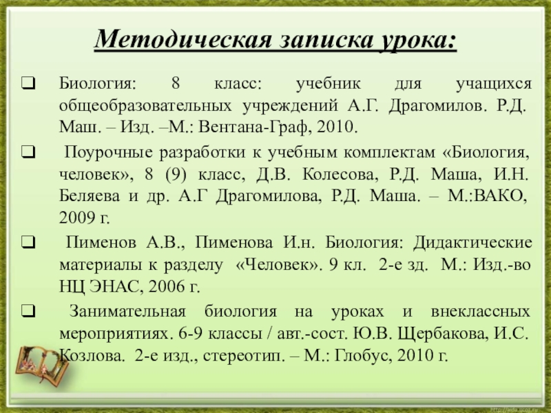 Поурочные разработки к учебным комплектам «Биология, человек», 8 (9) класс, Д.В. Колесова, Р.Д. Маша, И.Н. Беляева и др. А.Г Драгомилова, Р.Д. Маша. – М.:ВАКО, 2009 г.