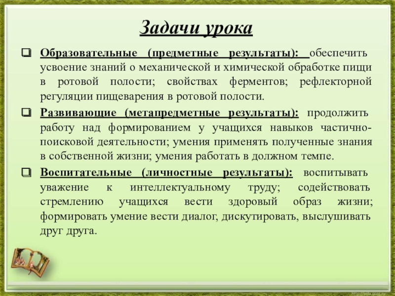 Воспитательные (личностные результаты): воспитывать уважение к интеллектуальному труду; содействовать стремлению учащихся вести здоровый образ жизни; формировать умение вести диалог, дискутировать, выслушивать друг друга.