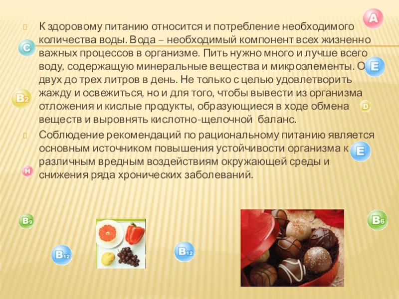 Слайд 10К здоровому питанию относится и потребление необходимого количества воды. Вода –