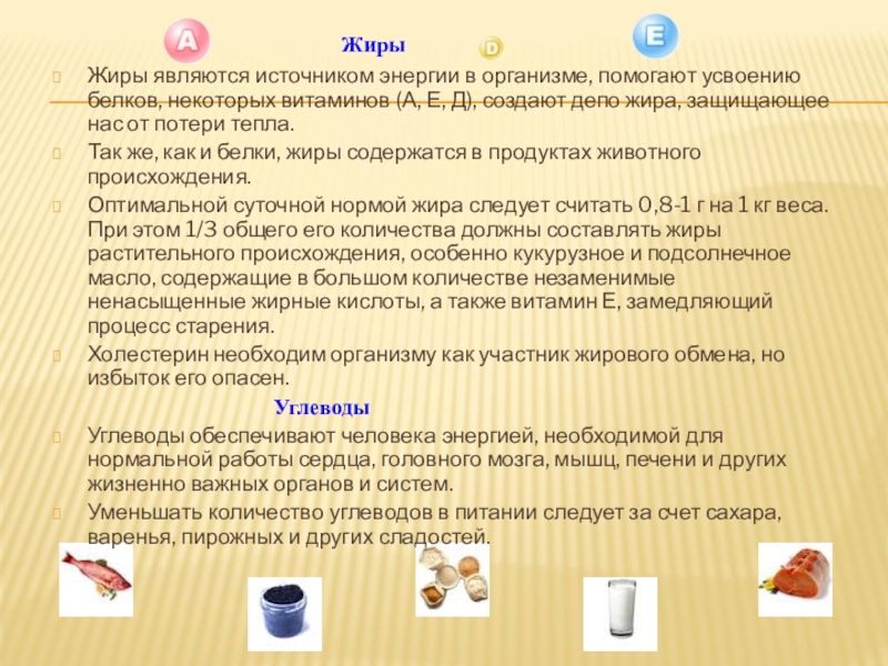 Жиры являются источником энергии в организме, помогают усвоению белков, некоторых витаминов (А, Е, Д), создают депо жира, защищающее нас от потери тепла.