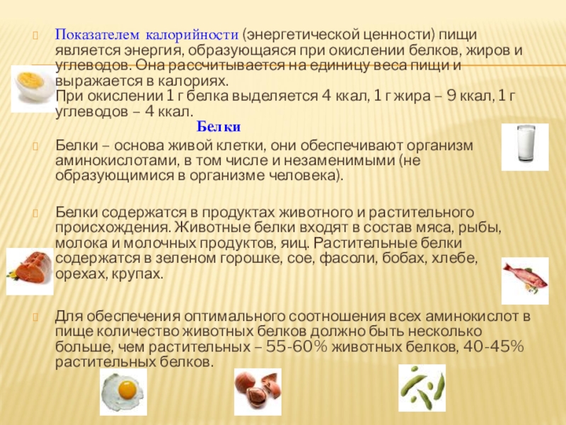 Слайд 7Показателем калорийности (энергетической ценности) пищи является энергия, образующаяся при окислении белков,