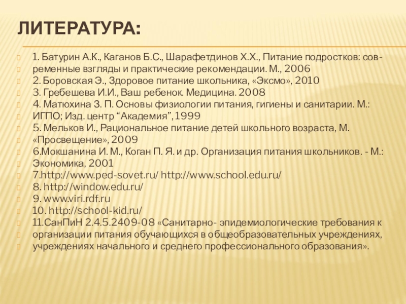 1. Батурин А.К., Каганов Б.С., Шарафетдинов Х.Х., Питание подростков: сов-