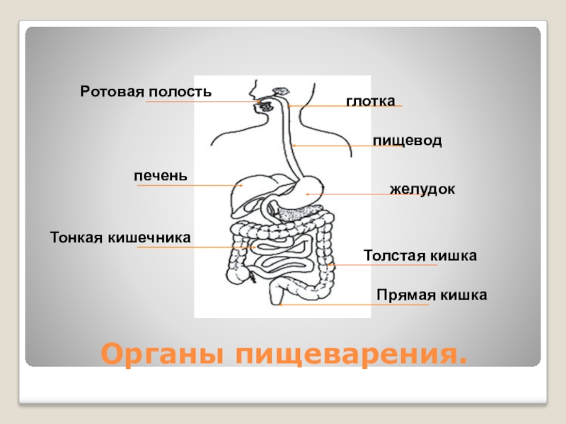 Органы пищеварения.глоткаРотовая полость пищеводпеченьжелудокТонкая кишечникаТолстая кишкаПрямая кишка