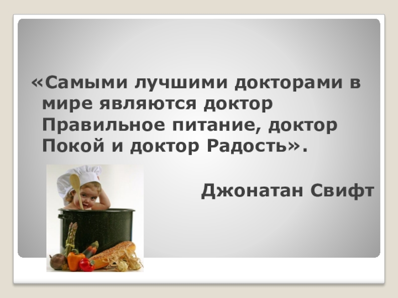 «Самыми лучшими докторами в мире являются доктор Правильное питание, доктор Покой и доктор Радость».Джонатан Свифт