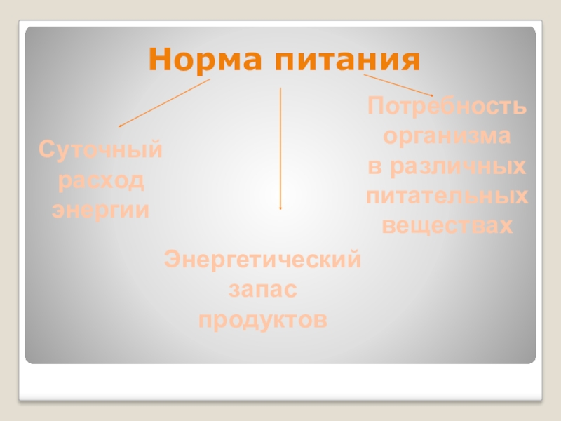 Норма питанияСуточныйрасход энергииЭнергетический запаспродуктовПотребностьорганизмав различныхпитательных веществах