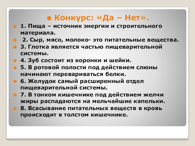Конкурс: «Да – Нет».1. Пища – источник энергии и строительного материала. 2. Сыр, мясо, молоко- это питательные