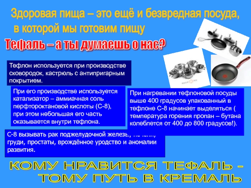 При нагревании тефлоновой посуды выше 400 градусов упакованный в тефлоне С-8 начинает выделяться ( температура горения пропан – бутана колеблется от 400 до 800 градусов!).