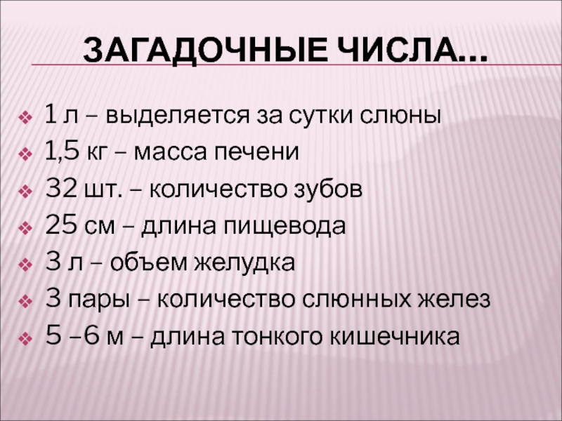 ЗАГАДОЧНЫЕ ЧИСЛА…1 л – выделяется за сутки слюны1,5 кг – масса печени32 шт. – количество зубов25 см