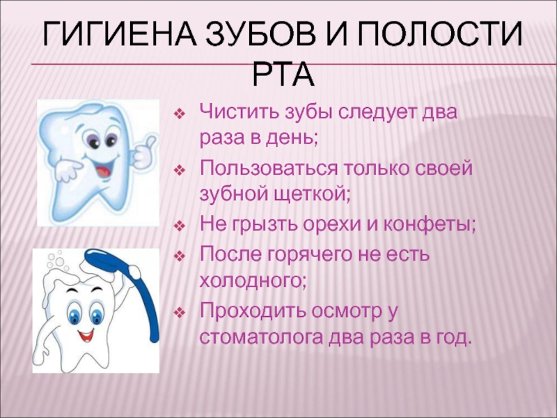 ГИГИЕНА ЗУБОВ И ПОЛОСТИ РТАЧистить зубы следует два раза в день;Пользоваться только своей зубной щеткой;Не грызть орехи