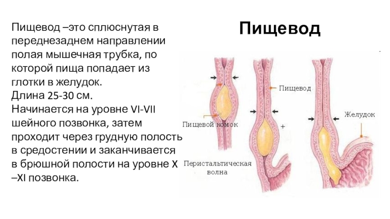 Пищевод –это сплюснутая в переднезаднем направлении полая мышечная трубка, по которой пища попадает из глотки в желудок.
