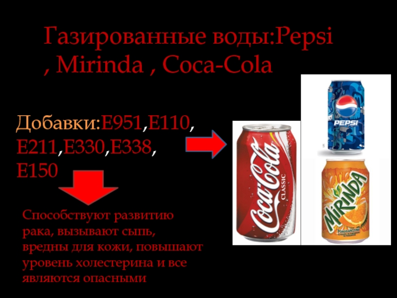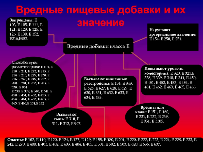Опасны: Е 102, Е 110, Е 120, Е 124, Е 127, Е 129, Е 155, Е 180, Е 201, Е 220, Е 222, Е 223, Е 224, Е 228, Е 233, Е 242, Е 270, Е 400, Е 401, Е 402, Е 403, Е 404, Е 405, Е 501, Е 502, Е 503, Е 620, Е 636, Е 637.