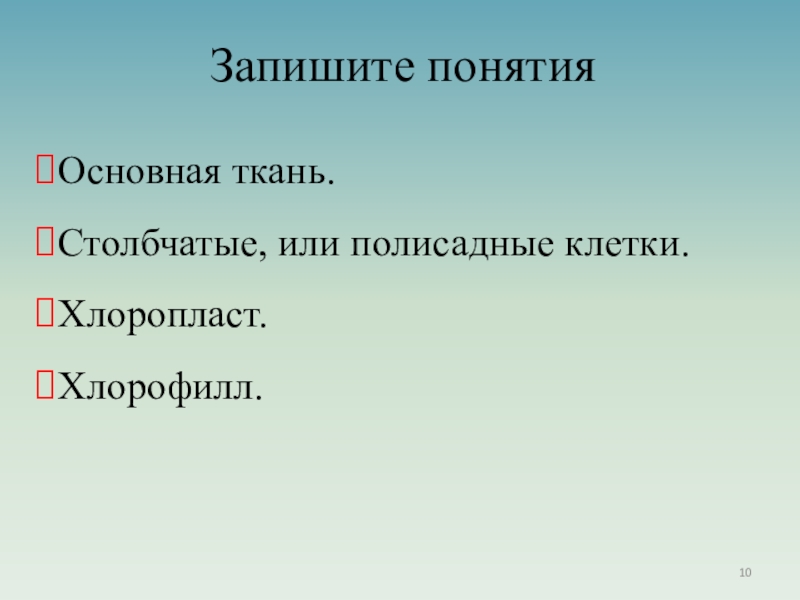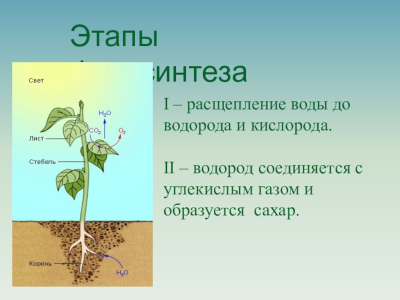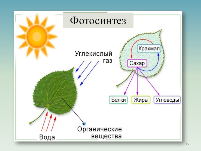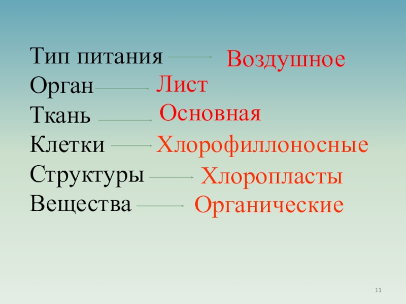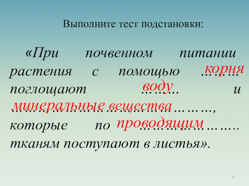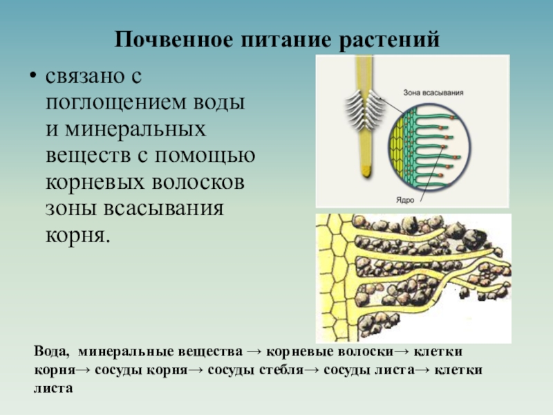 Вода, минеральные вещества → корневые волоски→ клетки корня→ сосуды корня→ сосуды стебля→ сосуды листа→ клетки листа