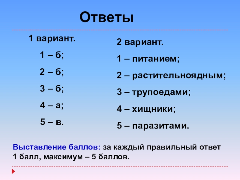 Выставление баллов: за каждый правильный ответ 1 балл, максимум – 5 баллов.