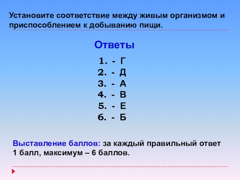 Выставление баллов: за каждый правильный ответ 1 балл, максимум – 6 баллов.