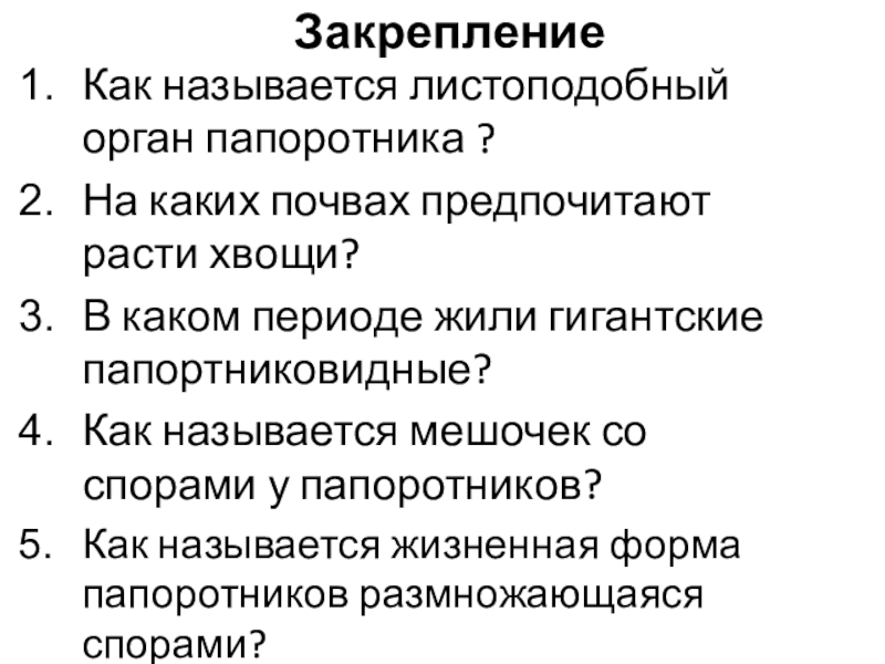 ЗакреплениеКак называется листоподобный орган папоротника ?На каких почвах предпочитают расти хвощи?В каком периоде жили гигантские папортниковидные?Как называется