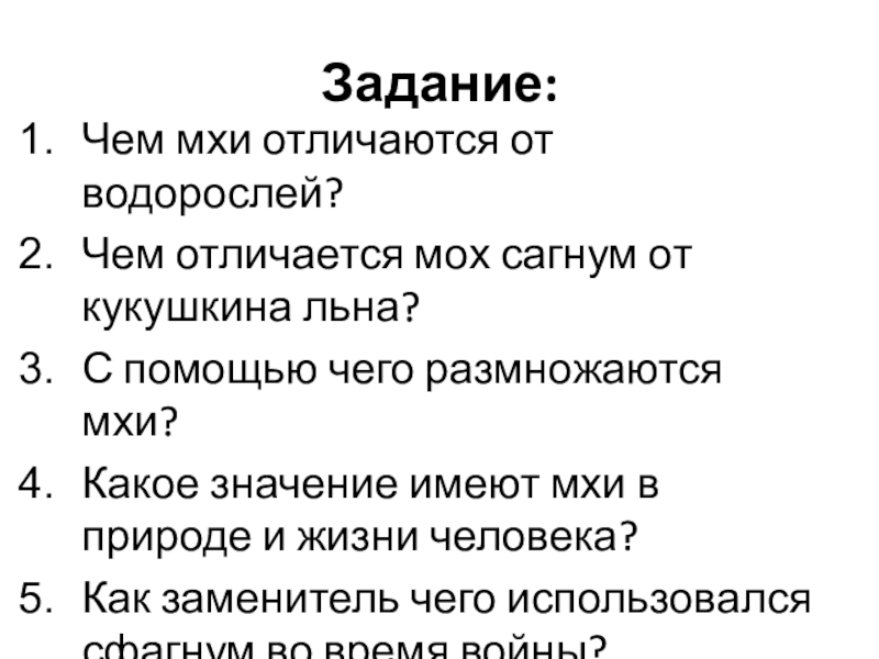 Задание:Чем мхи отличаются от водорослей?Чем отличается мох сагнум от кукушкина льна?С помощью чего размножаются мхи?Какое значение имеют мхи в природе и жизни человека?Как заменитель чего использовался сфагнум во время войны?