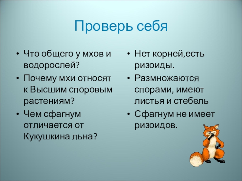 2. Сравните папоротники с мхами. Найдите признаки сходства и различия.
