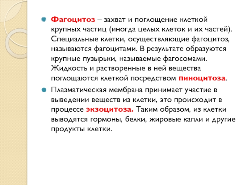 Слайд 19Фагоцитоз – захват и поглощение клеткой крупных частиц (иногда целых клеток