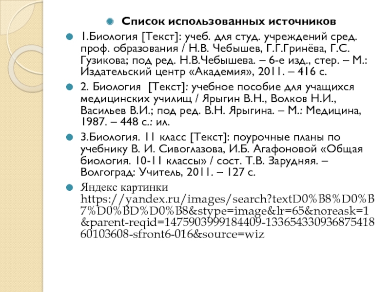 2. Биология [Текст]: учебное пособие для учащихся медицинских училищ / Ярыгин В.Н., Волков Н.И., Васильев В.И.; под ред. В.Н. Ярыгина. – М.: Медицина, 1987. – 448 с.: ил.