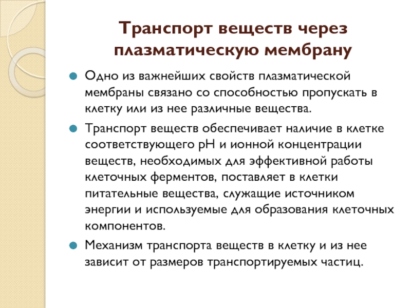 Транспорт веществ обеспечивает наличие в клетке соответствующего рН и ионной концентрации веществ, необходимых для эффективной работы клеточных ферментов, поставляет в клетки питательные вещества, служащие источником энергии и используемые для образования клеточных компонентов.