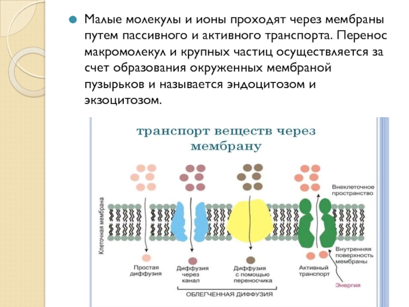 Слайд 14Малые молекулы и ионы проходят через мембраны путем пассивного и активного