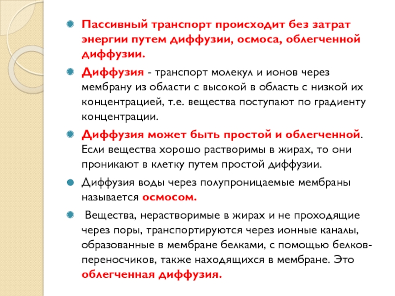 Слайд 16Пассивный транспорт происходит без затрат энергии путем диффузии, осмоса, облегченной диффузии.